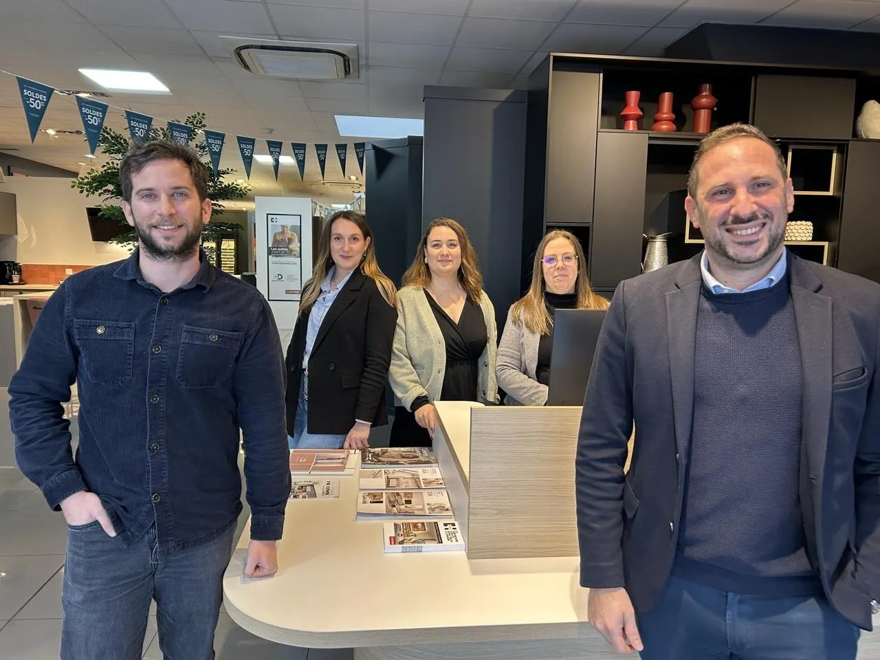 Angers, le 22 janvier 2026. Romain Hache, le nouveau gérant franchisé du magasin Cuisine plus à Angers (à droite), avec le responsable Jérémy Le Mestric et une partie de l’équipe angevine. © CO - Franck DE BRITO