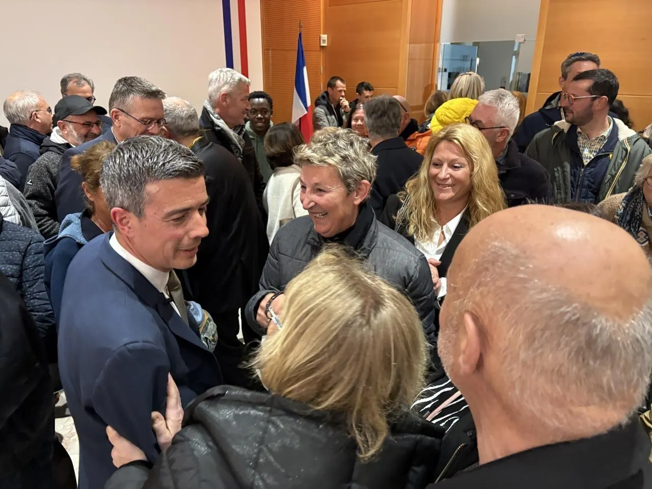 Nicolas Chénéchaud, félicité par ses soutiens, l'emporte largement aux Sables-d'Olonne à l'issue du second tour des élections municipales, dimanche 22 mars 2026. © Ouest-France