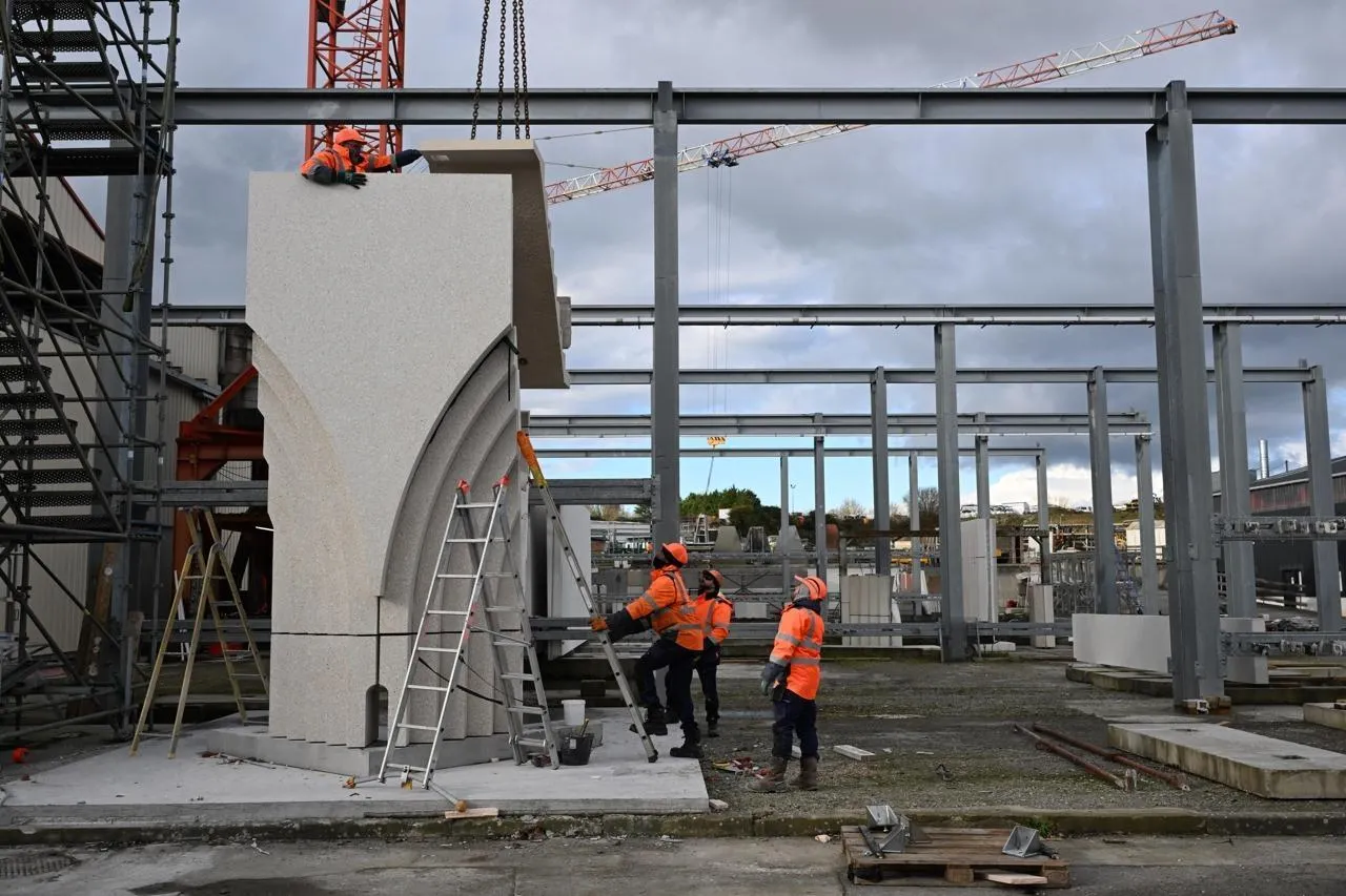 Le portique destiné à protéger le portail de la cathédrale Saint-Maurice d’Angers est préparé dans l’entreprise Jousselin de Chazé-Henry. © CO – Josselin CLAIR