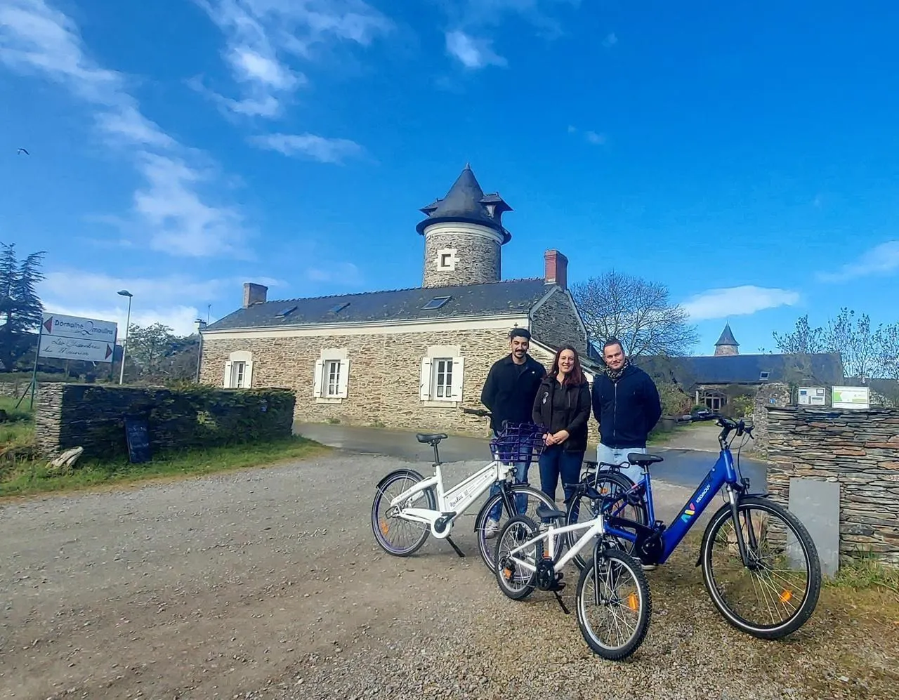 Lucie Macault, responsable d’œnotourisme au domaine des Deux moulins, a réceptionné, ce mercredi matin, la livraison des huit vélos livrés par les cogérants de la société Roulici, Antoine Mazière et Maxime Briant. © Ouest-France