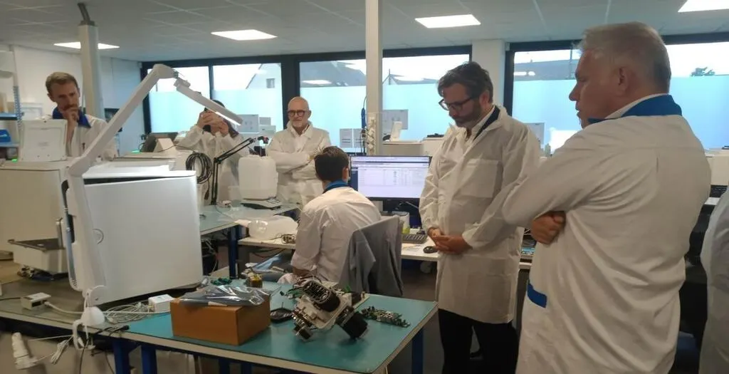 Visite de l’atelier de réparation avec le sénateur Emmanuel Capus (2e en partant de la droite) et le directeur, Julien Dolivet (au centre). © CO