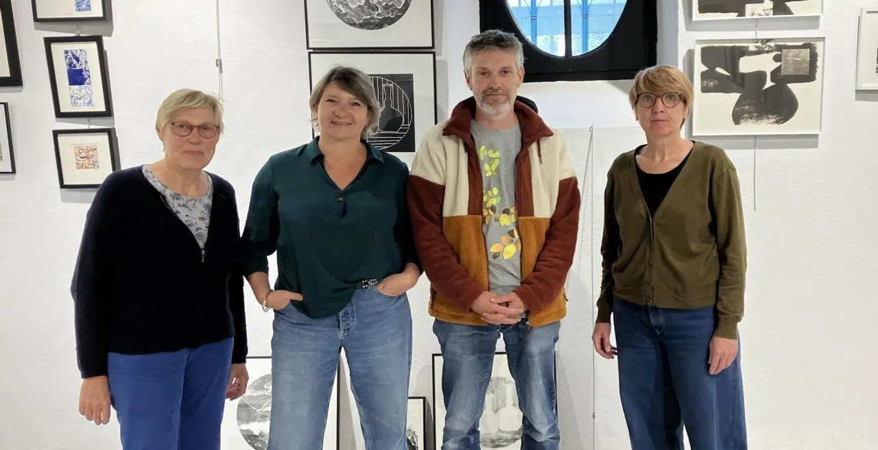 Hélène Duvauchelle, Laurence Caillé, Emmanuel Chenesseau et Marie Rabault, les concepteurs et organisateurs de cette exposition de gravures à Pignerolle. © CO.