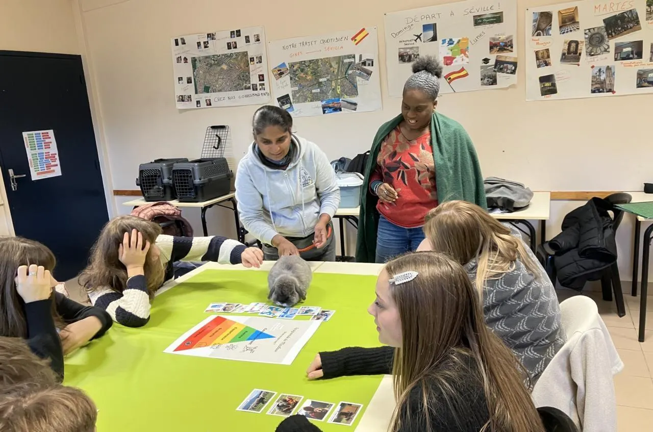 « J’ai amené deux chiens : un berger des Shetland et un lévrier whippet qui sont deux races totalement différentes afin de créer un effet miroir et laisser l’élève interagir avec celui qui lui correspond le mieux tant du point de vue morphologique que du comportement. Il y a aussi une petite rate, Ravioli, une dizaine de cochons d’Inde et quatre lapins béliers. La thématique d’aujourd’hui est l’expression des besoins. Selon la pyramide de Maslow, il y en a cinq indispensables : physiologique, sécurité, appartenance, estime et accomplissement. »