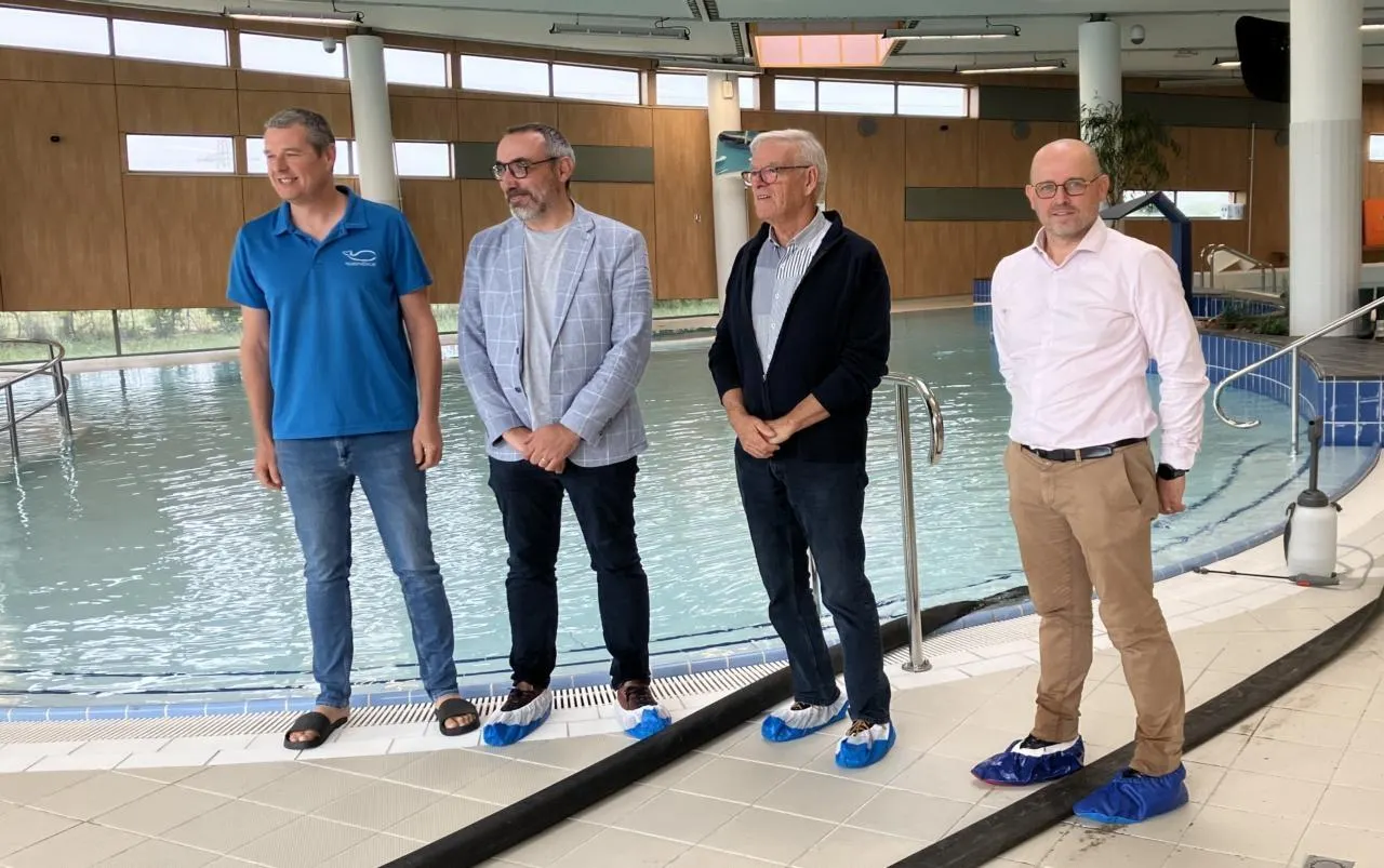 De g. à dr. : Xavier Coterel, directeur de la Baleine bleue ; Daniel Vicente, adjoint au sport ; Dominique Bréjeon, le maire ; et François Chevreux, directeur du service éducation, enfance et sport devant le bassin ludique © CO