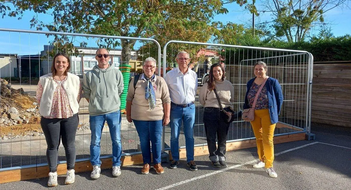 Devant la cour en chantier de l’école Pierre et Marie Curie, à gauche, les enseignants Camille Riou, directrice de l’élémentaire et Olivier Labourdette, directeur de la maternelle, les élus Christine Huu, adjointe à l’enfance et l’éducation et Dominique Bréjeon, maire et les conceptrices Manon Bernard de Sicle et Cyrille Blain, d’Infraconcept. © Ouest-France