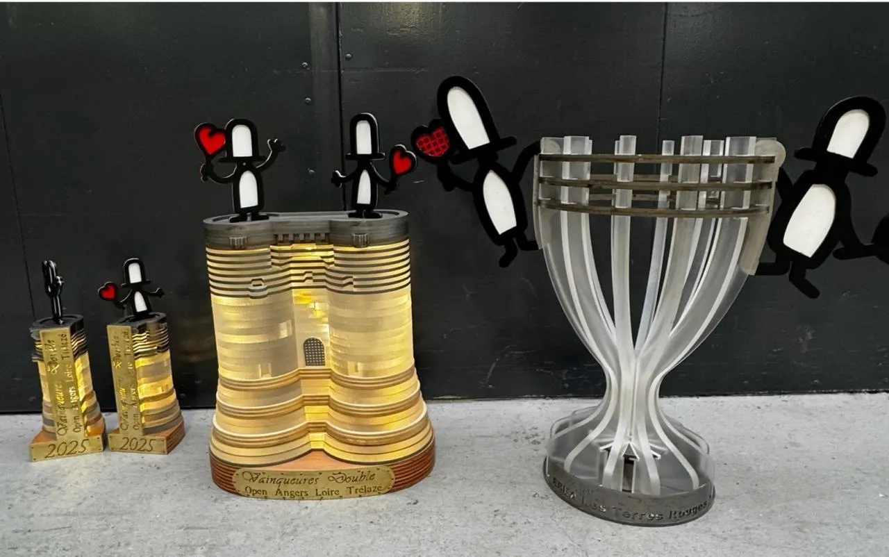 . » La coupe est en plexiglas et métal, le trophée inspiré des tours du château d’Angers est constitué de 50 couches d’acier, de bois et de plexiglas, et éclairé de l’intérieur. Comme le trophée du double reste au club, les jeunes ont demandé à réaliser une réplique plus petite du château, séparable en deux parties, afin que chaque joueuse de l’équipe victorieuse (cette année Tamara Korpatch et Jessica Ponchet) puisse repartir avec une moitié, symbole d’une réussite commune. Et les trophées sont surmontés des petits personnages caractéristiques de Botero Pop. Pour les deux enseignants : « Cette collaboration offre une belle visibilité du savoir-faire des élèves, tout en inscrivant leur travail dans un événement sportif d’envergure internationale