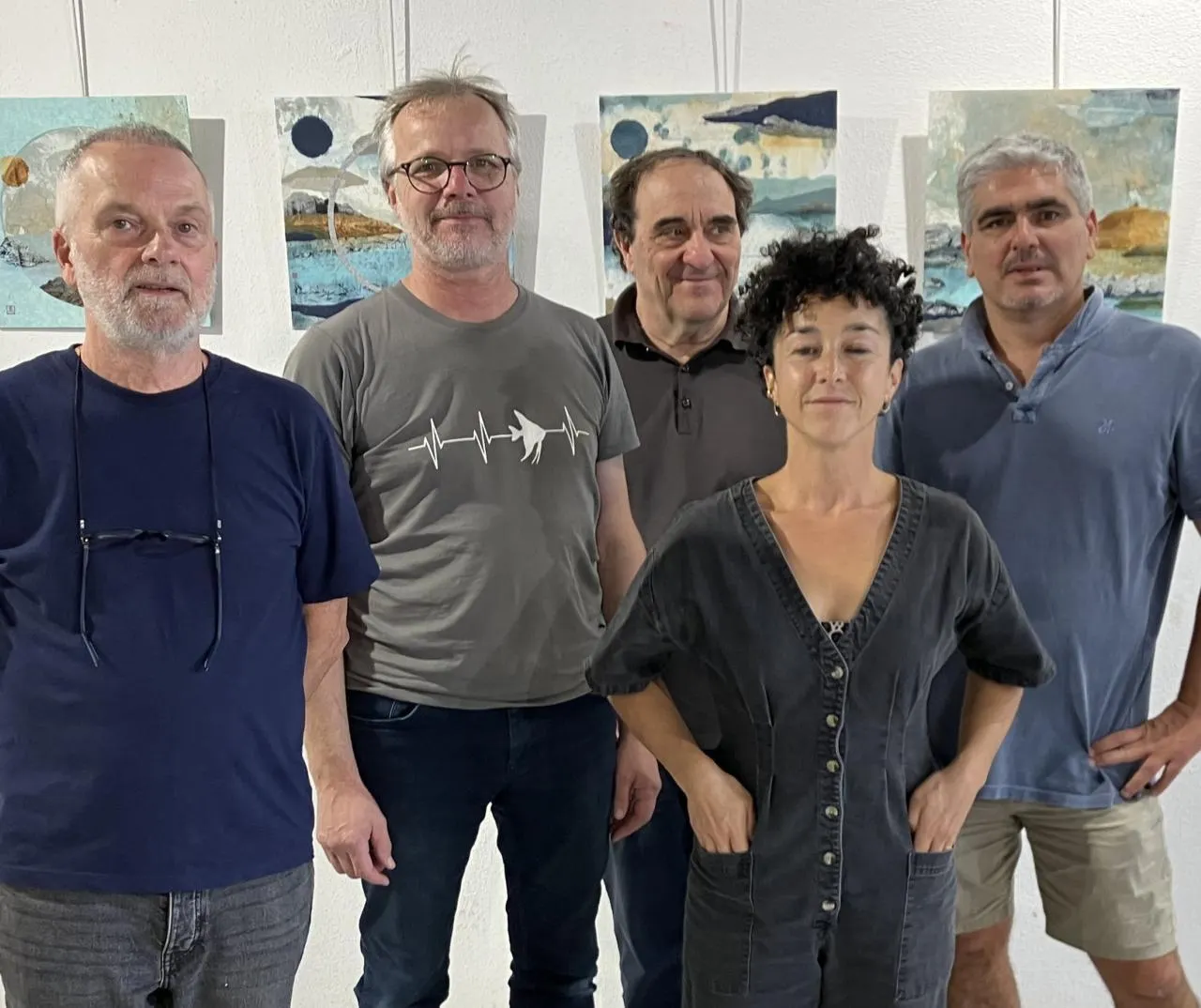 De g. à d. : Stéphane Chauvet, Régis Noël, Dominique Bonneau, Anissa Allam Vaquez et Jérôme Gourdon devant les toiles de Valérie Blanchard Jaulin. © CO