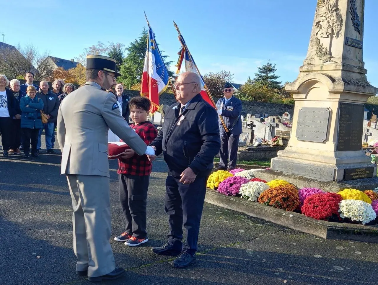 Les jeunes se sont beaucoup impliqués dans ce moment commémoratif. Au carré militaire, l’une d’entre eux a levé le drapeau, puis ils ont lu un texte sur les enfants de Saint-Barthélemy au début de la guerre. Pour rédiger leur texte, ils ont utilisé des documents trouvés par un historien archiviste local et l’Association des anciens combattants.