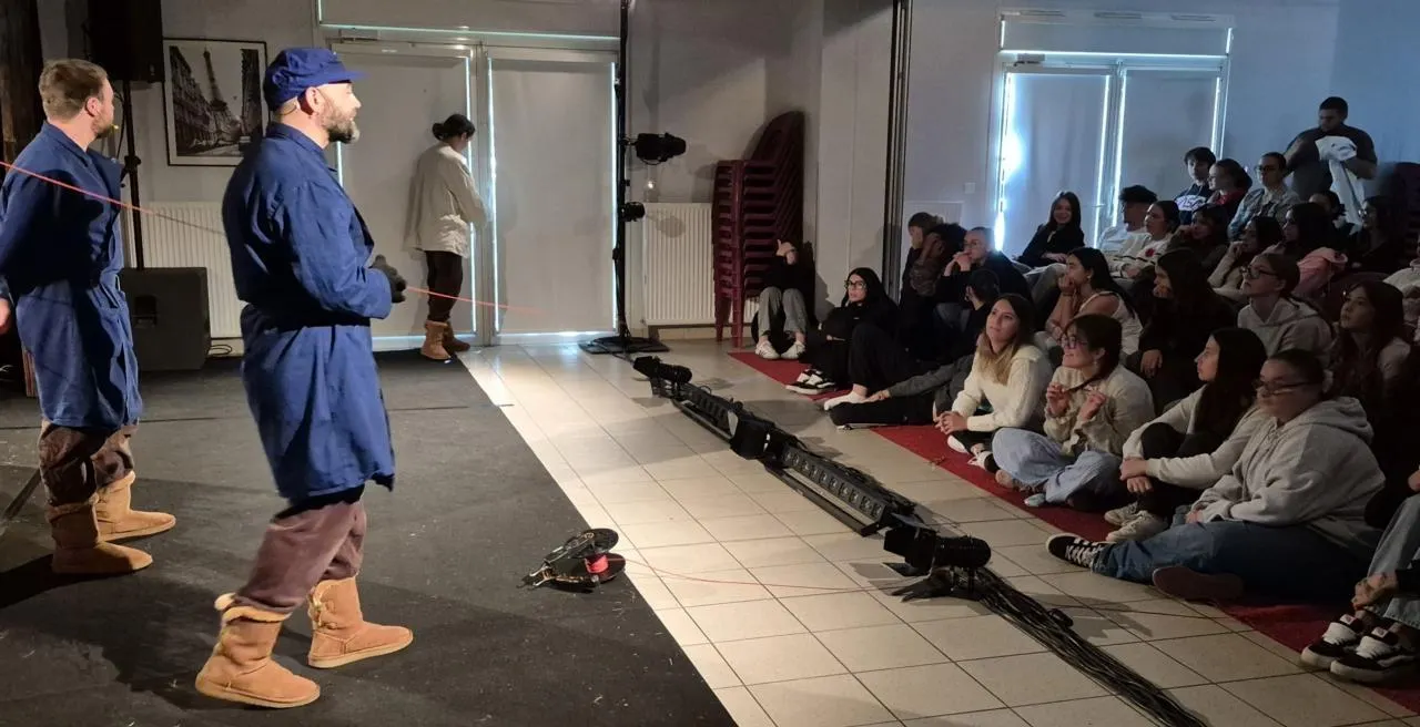Les acteurs de la troupe Les Combattants variables devant les élèves en BTS de la MFR Le Cèdre. © CO.