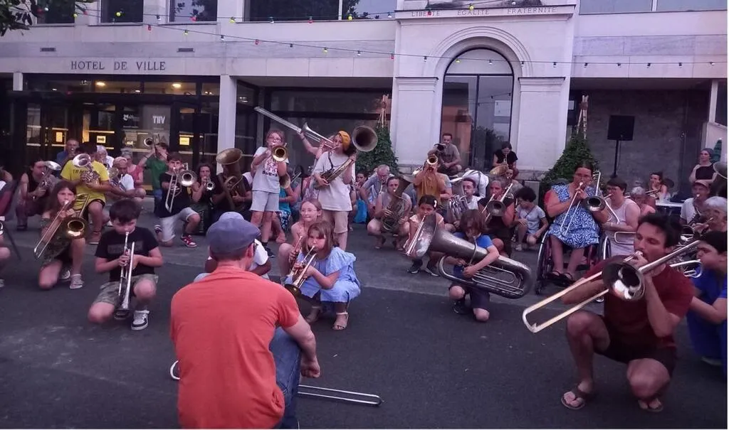 Vendredi dernier, la participation collective a été double, lors de la soirée guinguette qui s’est tenue devant le THV. Pour clore la saison, étaient invités l’orchestre des Chefs, qui a joué des hits des années 1970, puis la fanfare de la Touffe, composée de plus de 70 personnes volontaires, tous âges confondus. Faisant sonner tubas, saxos, trombones, clairons et trompettes, ils ont déboulé autour de et dans l’église, avant de terminer leur concert sur les marches de la mairie.