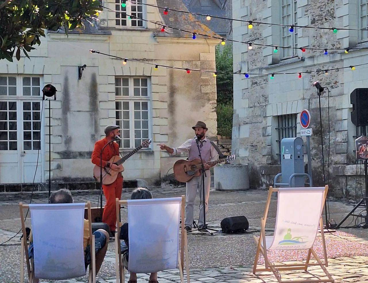 Ce 25 juillet, pendant que les gens profitent d’une météo clémente, ni pluie, ni canicule, deux dandys élégants poussent la chansonnette. Léopold Newman et Albert Redford pratiquent « l’Arnaque ». Ils détournent avec humour les paroles de chansons françaises. Avec pour seuls instruments leurs guitares, pas si facile de reconnaître les airs. Parfois, c’est évident : Il y avait du Cabrel ».