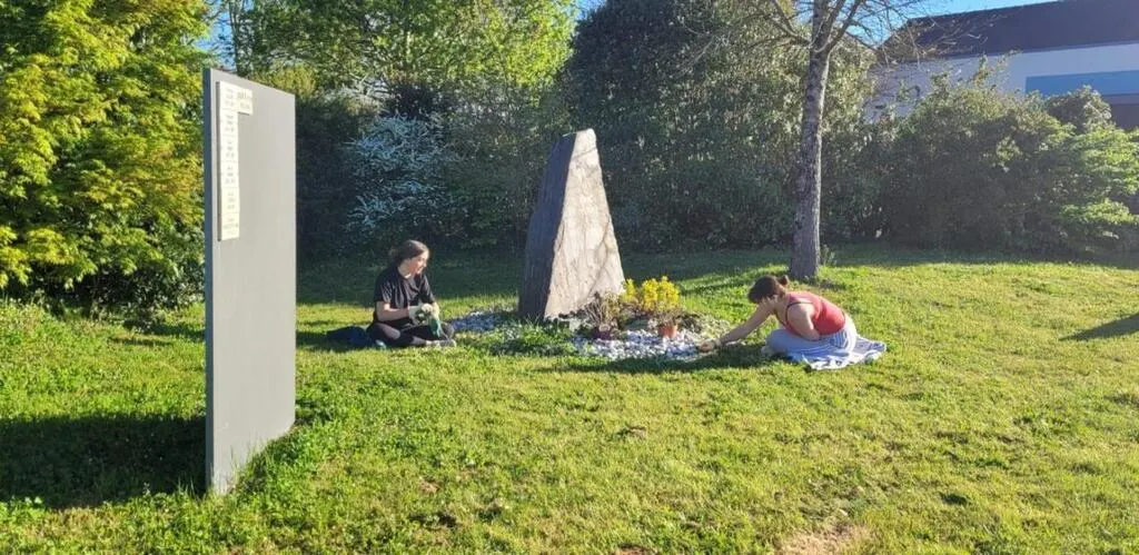 Au fond du cimetière, deux jeunes adolescentes ont nettoyé les abordsde la stèle du jardin du souvenir. © CO
