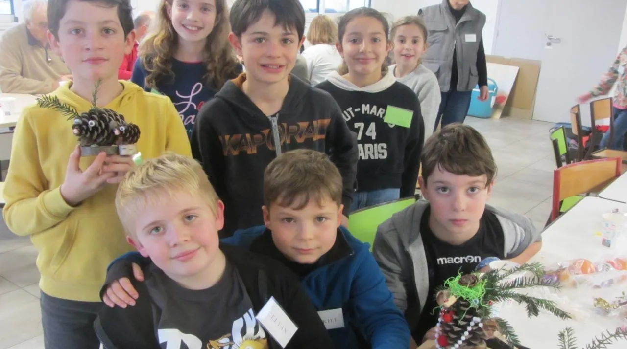 Au club nature, Celyan, Gabriel, Melaine (assis), Nathan et Louison (debout) ont fait preuve de créativité pour confectionner ces petites décorations à partir d’une pomme de pin cueillie dans le bois voisin. Mardi 23 décembre, ils ont aussi planté une haie bocagère avec l’aide de leurs animateurs et de la Fédération de chasse du Maine-et-Loire, qui a fourni les plants. © Ouest-France