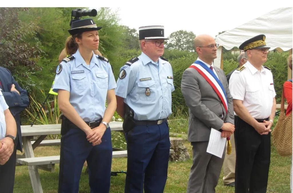 Les gendarmes, Franck Poquin, maire de Saint-Léger-de-Linières, ceint de l’écharpe tricolore, et Philippe Chopin, préfet de Maine-et-Loire, écoutent le discours de Martine Richoux présidente de l’AAPA à l’occasion de cette cérémonie. © CO
