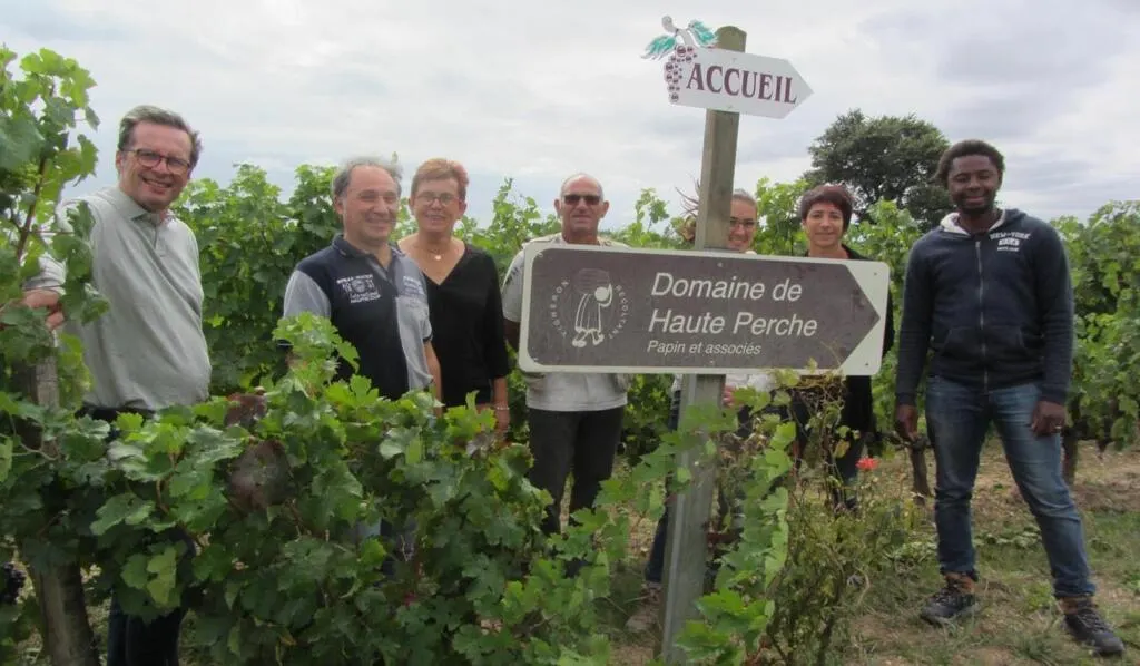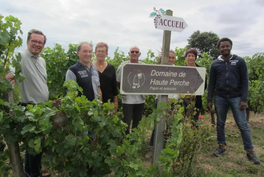 Thierry Denjean (à gauche), expert-comptable, a repris le domaine de Haute-Perche en 2019. L’équipe initiale, composée de Serge Bertrand, chef de chai ; Josiane Halopé, administrative et Christophe Bernard, chef de culture, a été rejointe par Camille Drouard, à l’œnotourisme ; Manuela Matignon, œnologue et Idrissa Diakilé, tractoriste. © Ouest-France