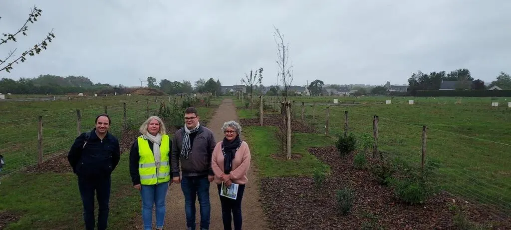 Les élues, Jeanne Marie Brébion ( à droite ) et Isabelle Clémot, lors de la visite du chantier, avec les représentants d’Alter Public, Freddy Durandet ( à gauche ) et Julien Mauboussin, sur le chemin de la coulée verte, au cÅ“ur du futur lotissement de la ZAC du Grand clos. © Ouest-France