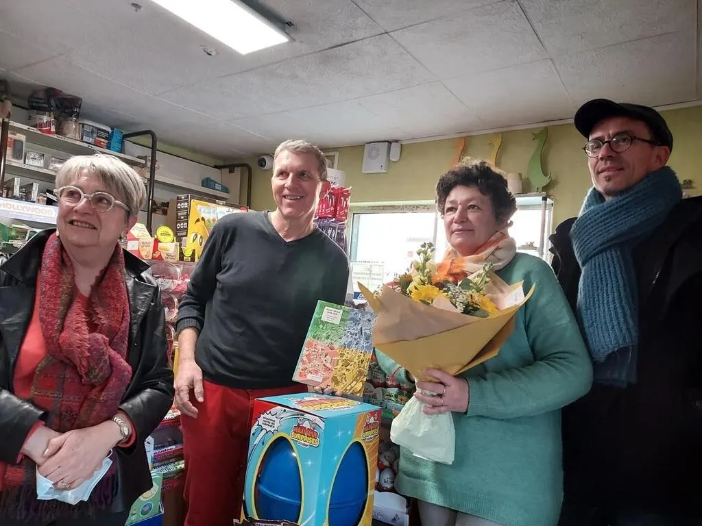 La cérémonie de remerciements à Sandra Cerisier ( avec le bouquet ) s’est tenue dans le petit tabac presse de la commune. Le président de l’association Report’cité, Yves Boiteau (à droite) et Olivier Bomard, ainsi qu’une bénévole de l’association, découvraient les charmes de ce tabac presse. © Ouest-France