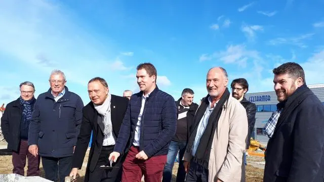 À droite du maire (3e à gauche), Thierry Simelière, Stéphane Le Rouzes et Xavier Gross-Quelen, lors de la pose de la première pierre, mardi 13 novembre, au matin. © OUEST-FRANCE