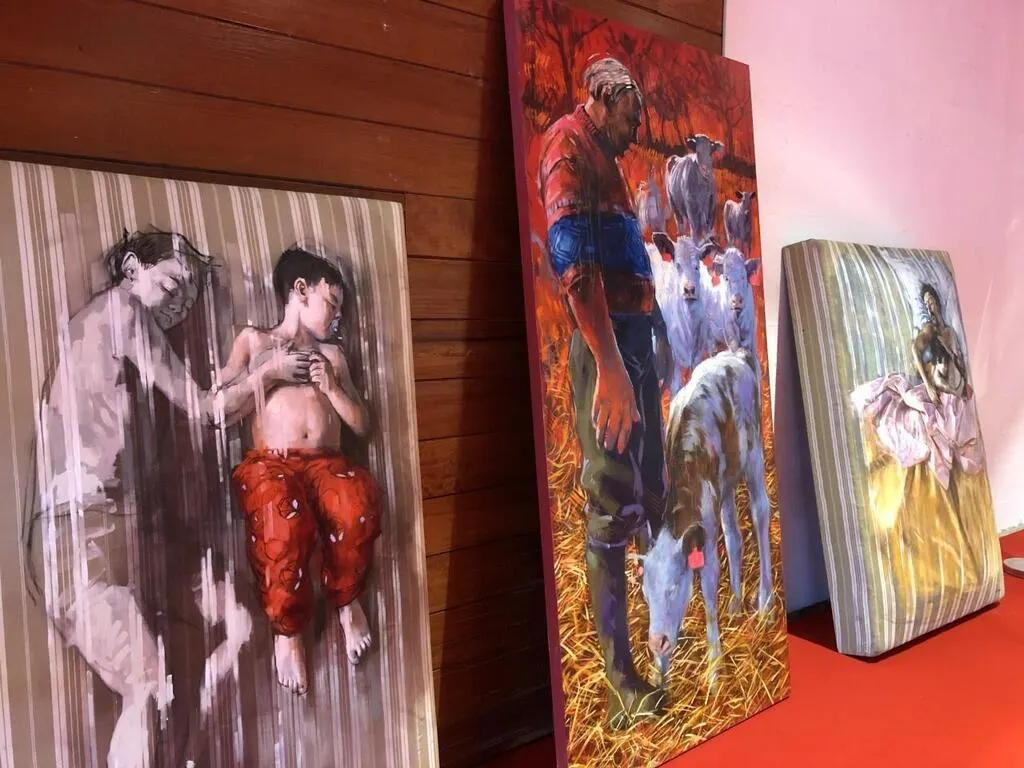 Cette semaine, l’artiste a installé ses œuvres : des tableaux mais aussi des peintures huiles réalisées sur de vrais matelas intitulées Les endormis. Celles-ci avaient été réalisées pour le salon angevin 49 Regards.