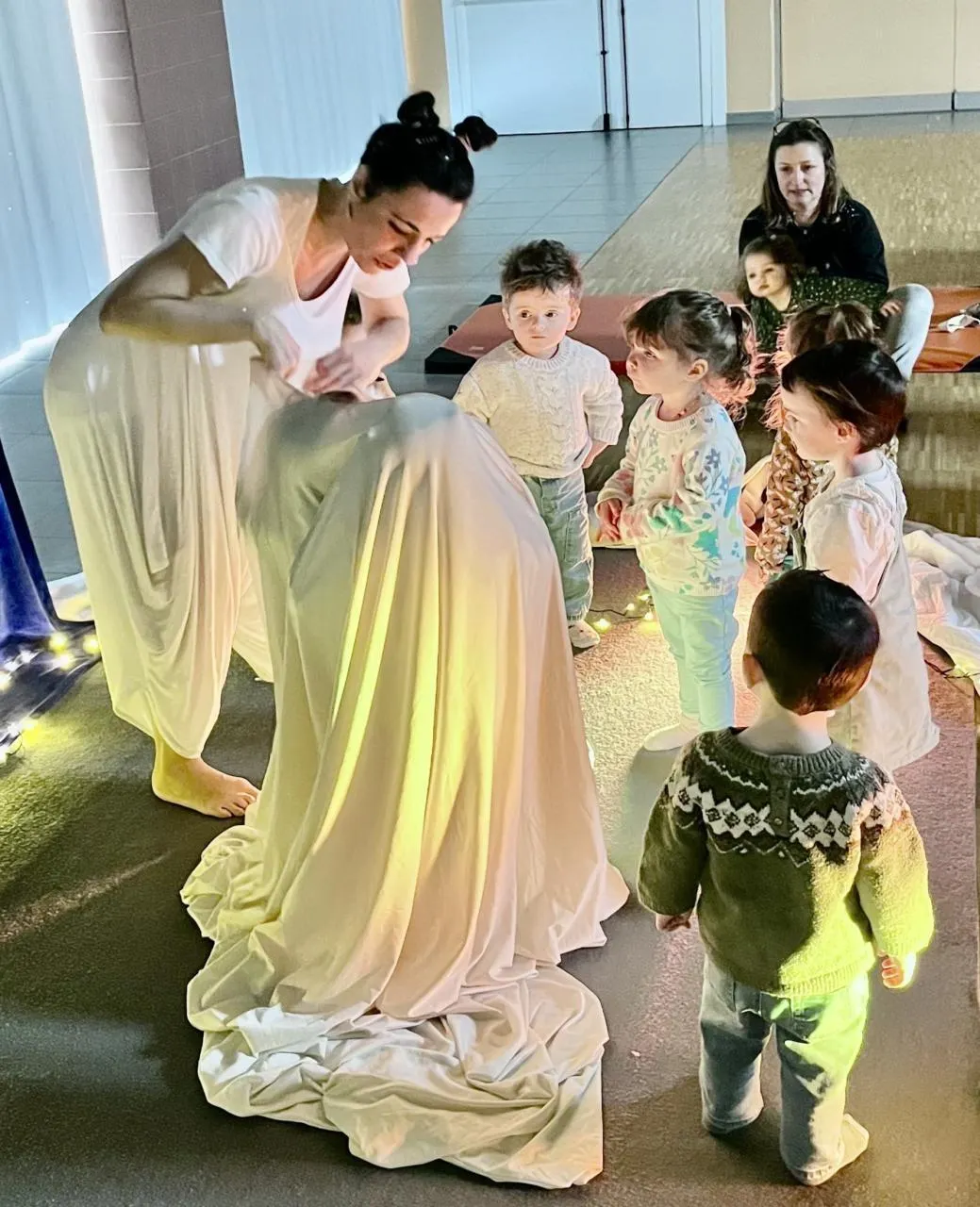 La danseuse et comédienne, Sabrina Maillé, évolue dans un tissu en lycra blanc qui se tend, s’étire. Des formes apparaissent et se transforment. Dans ce mouvement, un être apparaît, puis un autre. Une rencontre. Deux apparitions qui se reconnaissent, partagent et s’épaulent. Grandir et prendre son envol pour s’ouvrir au monde. Le spectacle est conçu pour stimuler l’imaginaire des jeunes enfants à travers le mouvement du tissu, ses formes et les lumières mouvantes qui donnent de multiples couleurs au spectacle.