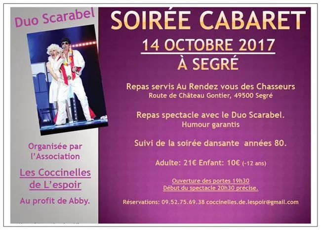 Repas spectacle organisée par l'association Les Coccinelles de l'espoir, avec la participation du Duo Scarabel. réservations jusqu'au 11 octobre