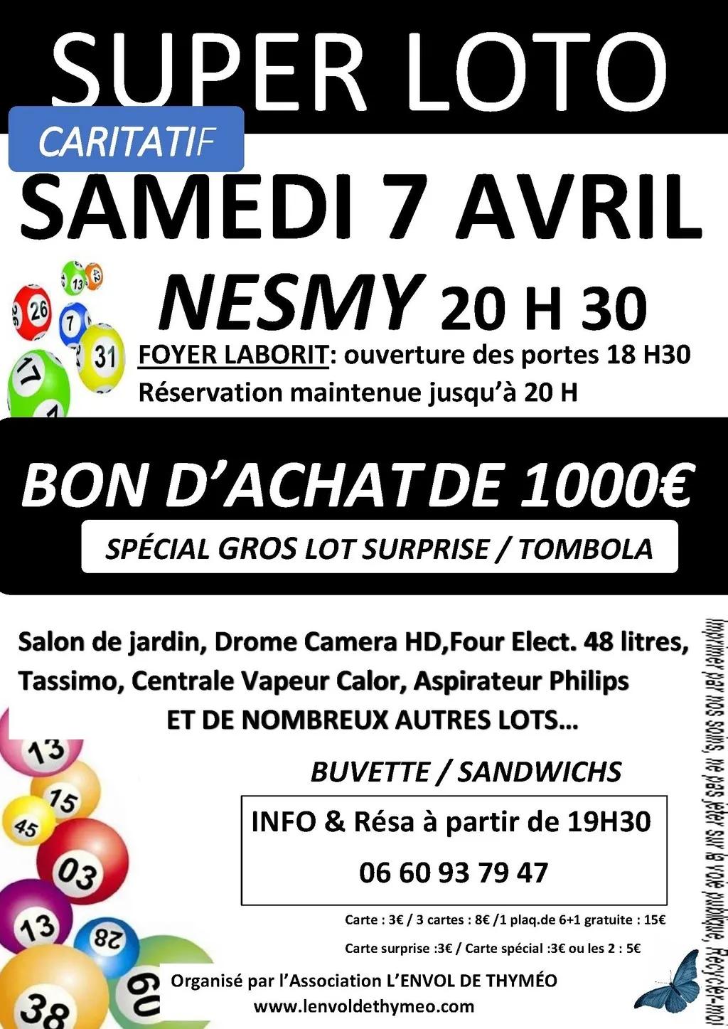 SUPER LOTO CARITATIF organisé par l'Association L'ENVOL DE THYMEO . Les bénéfices de la soirée permettra à Thyméo, porteur d'une maladie génétique rare, de financer du matériels adaptés et des soins liés son handicap non prise en charge.