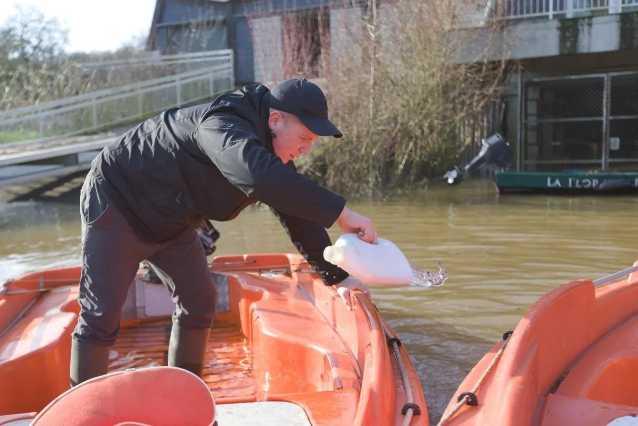 Autour de la base nautique de Saumur (Maine-et-Loire), sur le Thouet, les mariniers sont à l’œuvre pour écoper et sécuriser les bateaux et les installations tandis que le niveau de l’eau monte.