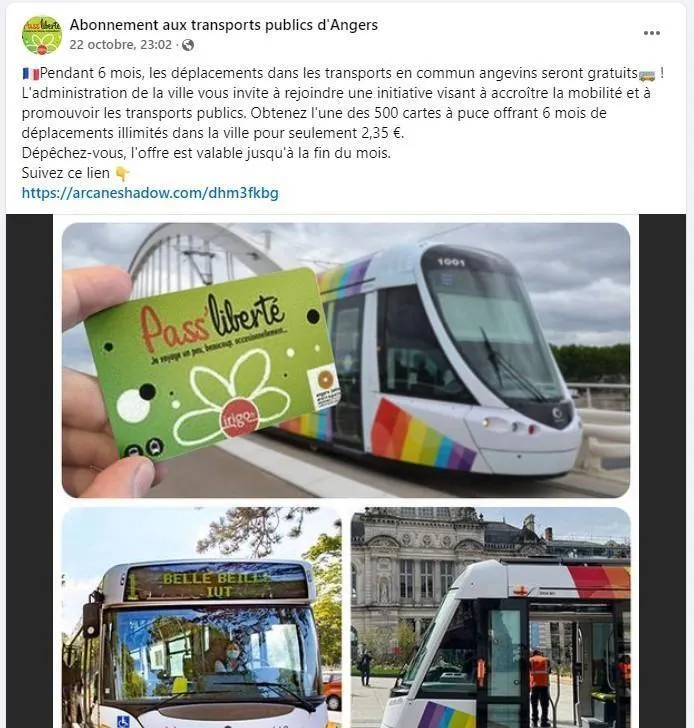 Un compte sur Facebook propose d’acheter une carte pour bénéficier gratuitement, pendant six mois, des transports en commun à Angers (Maine-et-Loire). Il s’agit d’une arnaque qui a concerné d’autres villes, comme Cholet.