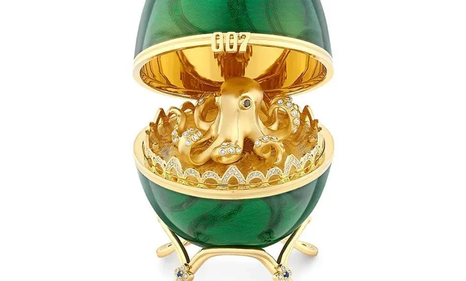 Ce petit œuf, produit à seulement 50 exemplaires, est en or, peint d’émail vert et incrusté de diamants ainsi que de deux saphirs. Le pendentif, qui mesure environ 8,4 centimètres, rend hommage au film James Bond : Octopussy (1983), dont l’intrigue repose justement sur un trafic de bijoux autour d’un faux œuf Fabergé.