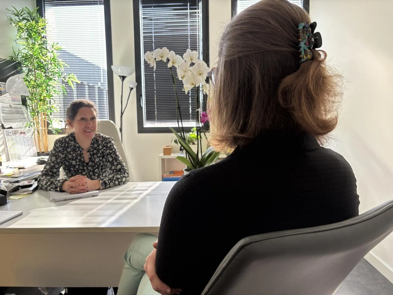 Marie Cevaer, de dos, en discussion avec son avocate Me Christelle Poirier, dans le cabinet de cette dernière, mardi 3 mars 2026 à Angers. © CO