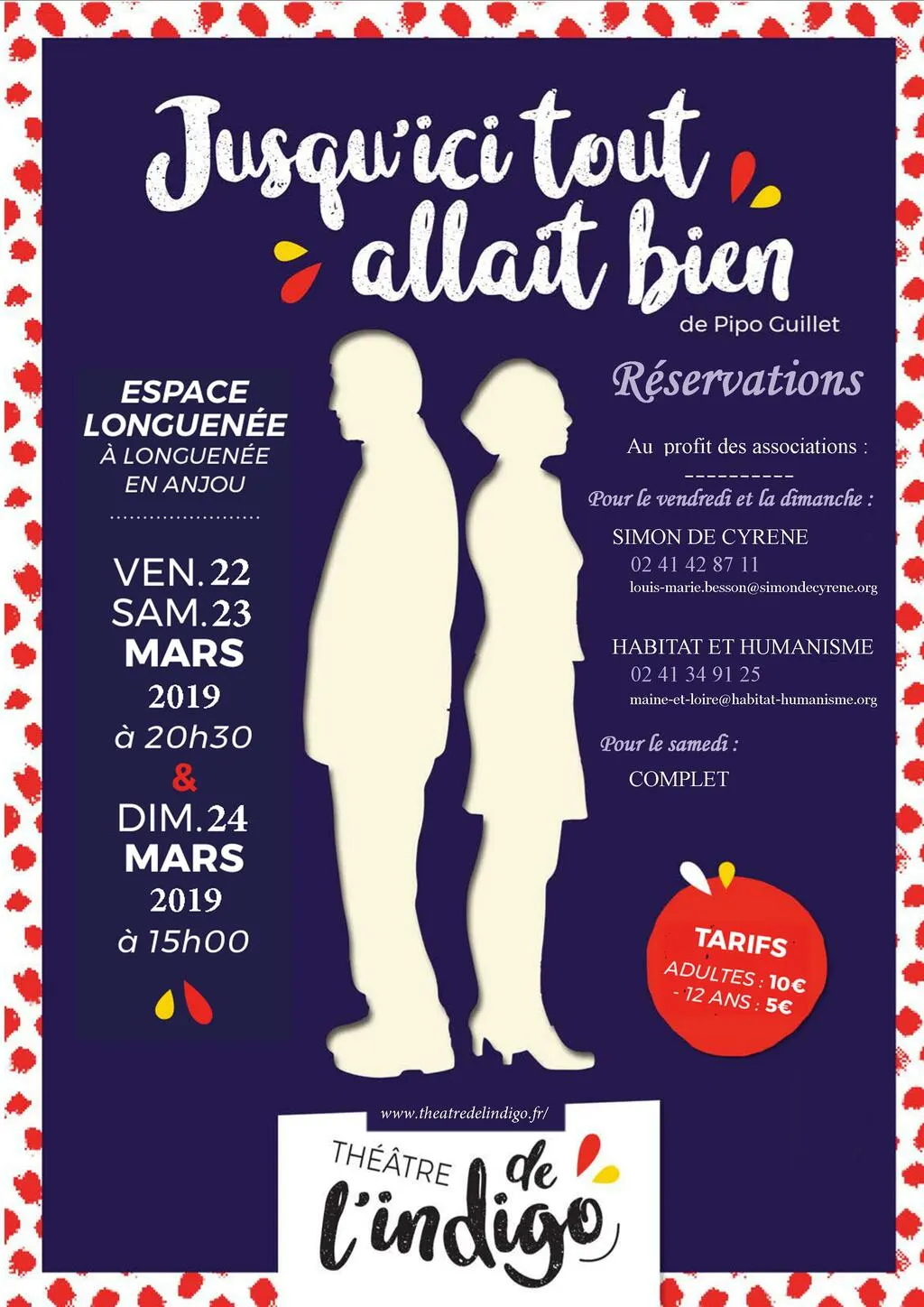 Comédie proposée par la troupe de l'Indigo (Longuenée en Anjou), en partenariat avec les associations Habitat et Humanisme Maine-et-Loire et Simon de Cyrène Anjou.