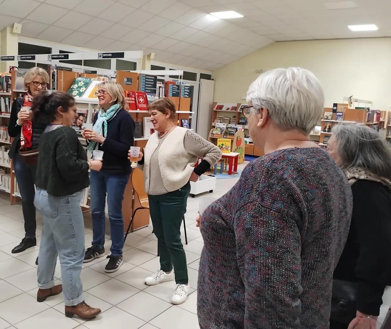 Lou-Ann, au premier plan à gauche, en discussion avec les bénévoles de la bibliothèque de Tiercé. © Ouest-France.