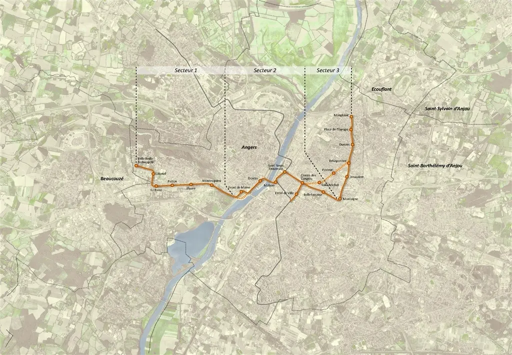 tracé d'étude de la ligne B du tramway d'Angers