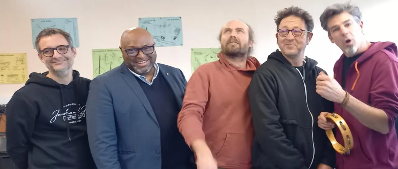 De gauche à droite : Régis Prud’homme, professeur de musique au collège, Lamine Naham, maire, Mickaël Herguais, à la guitare et au chant, Jean Legendre, à la basse, et Erwan Frazier, au violon, à la mandoline et aux percussions (groupe Lucien Gustave trio). © Ouest-France