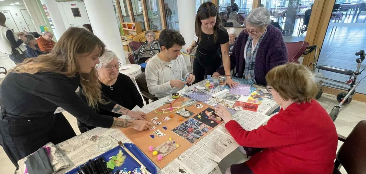 Un moment riche en émotions s’est déroulé à la résidence avec des étudiants BPJEPS (Brevet professionnel de la jeunesse, de l’éducation populaire et du sport) venus proposer un projet autour de l’art-thérapie. Pour cette séance, ils étaient accompagnés par l’artiste Nina Faustine, qui a guidé habitants et jeunes dans une démarche créative autour de la peinture, de la photo et des souvenirs d’enfance. L’objectif était double : stimuler la mémoire et favoriser l’expression émotionnelle. L’ambiance, à la fois chaleureuse et respectueuse, a permis de créer un véritable lien intergénérationnel, où chacun a pu partager son vécu et sa sensibilité artistique.