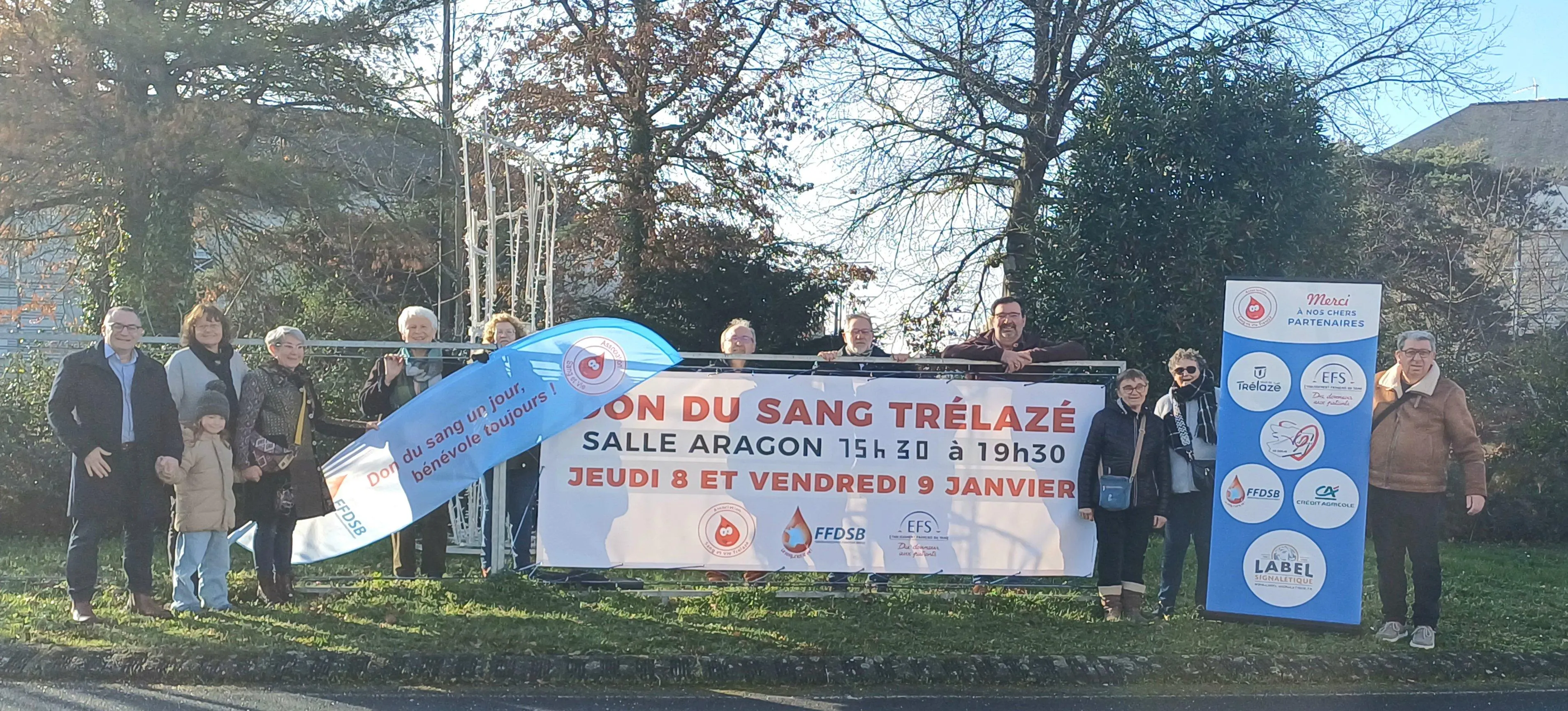 Trélazé, rond-point du Buisson, le 2 janvier 2026. Mise en place des nouvelles banderoles par les membres de l’association Sang et Vie Trélazé, en présence du directeur du Crédit agricole, partenaire (à gauche). © COÂ