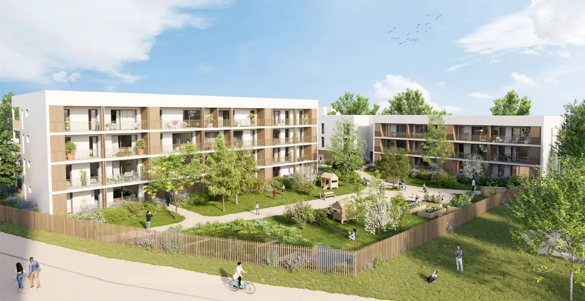 Les deux bâtiments à l’architecture contemporaine s’organisent autour d’un mini-parc central, doté d’une aire de jeux, de bacs potagers et d’espaces de détente. Chaque logement dispose d’une loggia ou terrasse, et bénéficie d’équipements pratiques : cellier, parking souterrain et local vélos sécurisé.