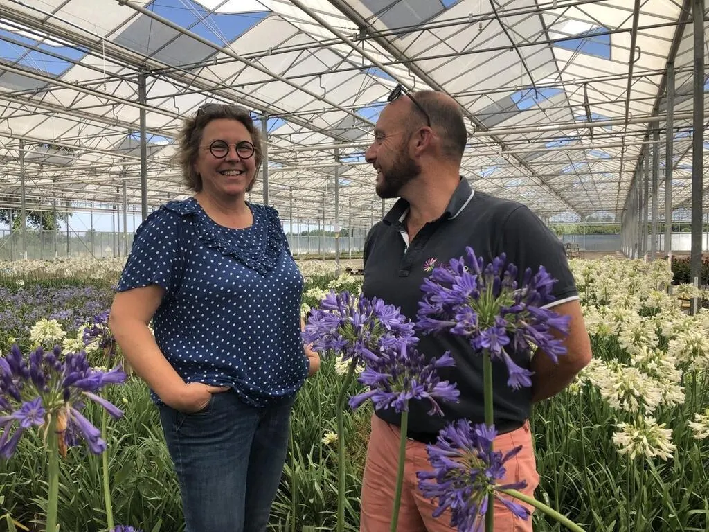 Mazé-Milon, le 19 juin 2025. Cécile et Mark Hodson, ici dans leur nouvelle serre, sont à la tête de Turcieflor (la pépinière Pierre Turc) depuis 2010. Les agapanthes que l’on voit sur cette photo sont l’une de leurs spécialités. © CO – Christophe RICCI