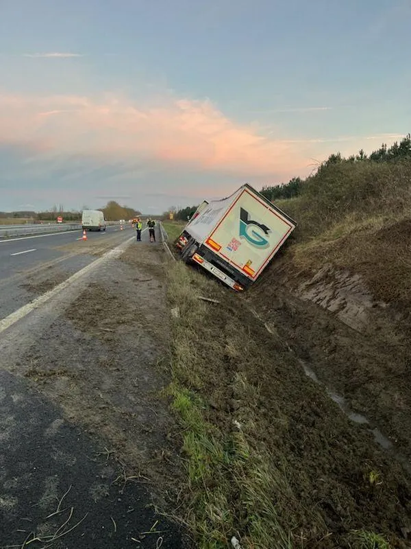 Un camion fait une sortie de route et termine dans le fossé sur l’A85, entre Angers et Tours... |