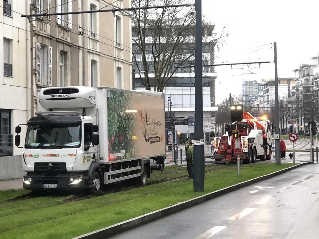Un camion se retrouve coincé dans la boue sur les voies du tramway : le trafic perturbé à Angers... |
