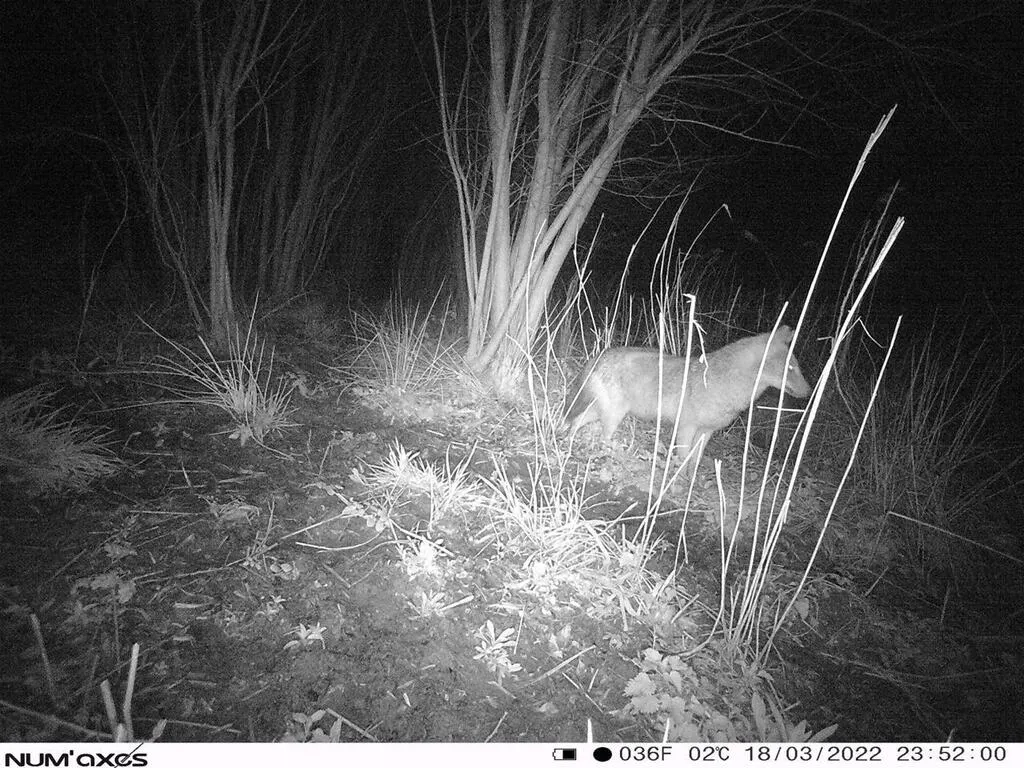 Un chacal doré a été photographié par un appareil automatique, le 25 avril 2023, à Saint-Molf, en Loire-Atlantique. Ici, dans le Finistère en mars 2022. © DR