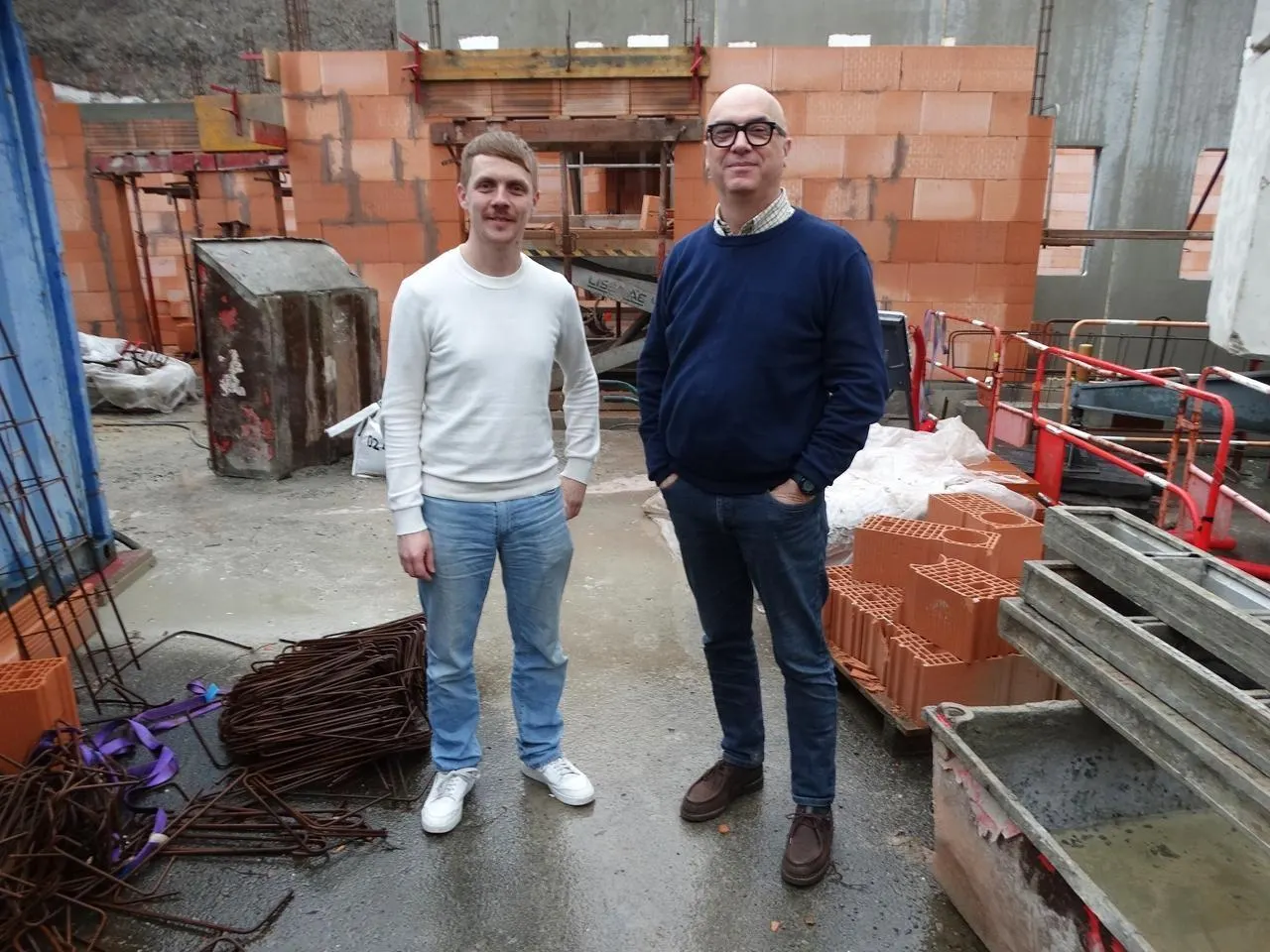 Benjamin Giet et Bernard Calmet devant les travaux d’extension de l’École de musique de Chemillé-en-Anjou avec, peut-être, de nouvelles idées d’instruments pour les Fo’Plafonds. © Ouest-France