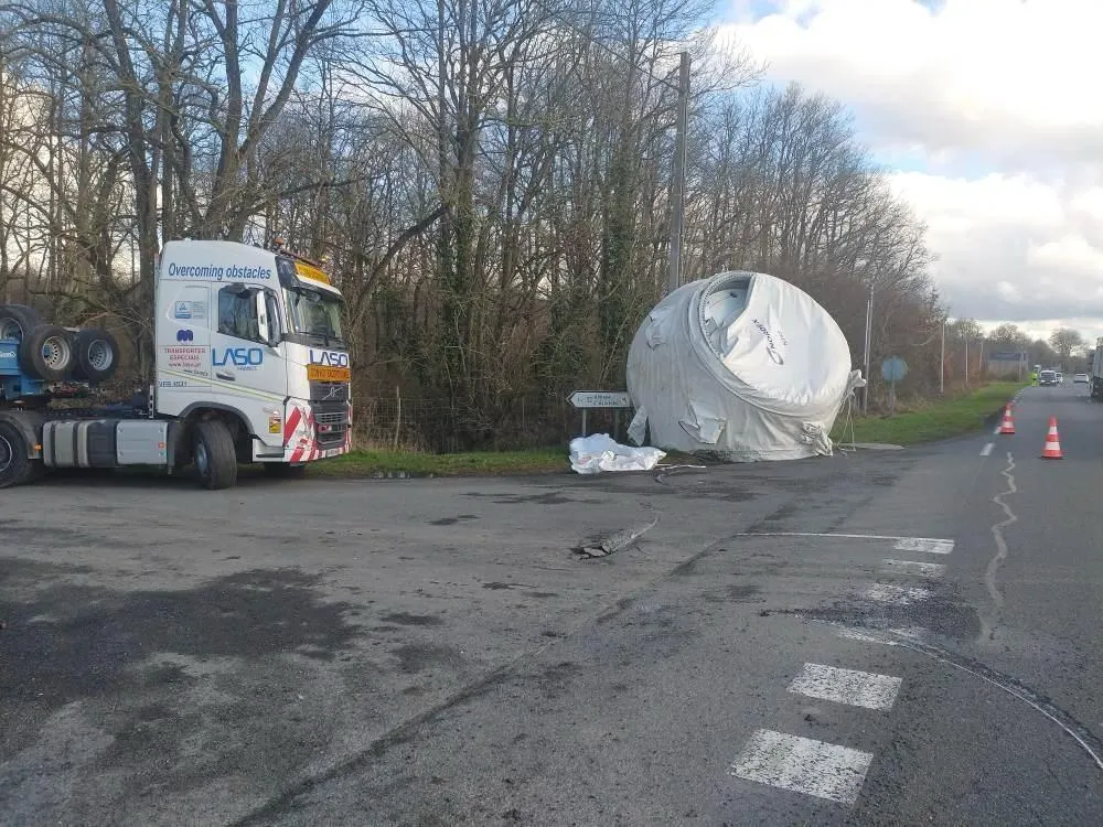 Un convoi exceptionnel perd un morceau d’éolienne de 50 tonnes sur une route d’Anjou... |