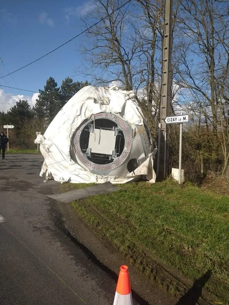 Un convoi exceptionnel a perdu un morceau de son chargement sur une route départementale à Brossay. © DR