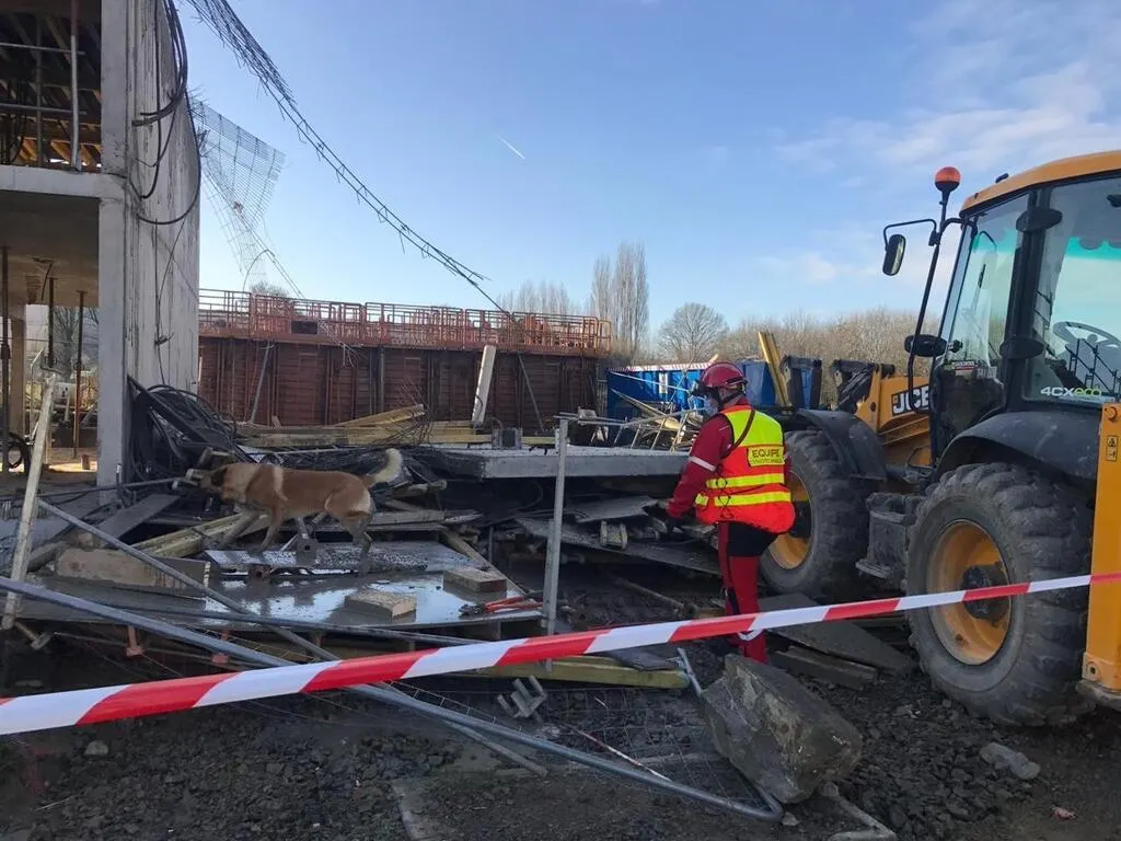 Une dalle de béton s’est effondrée sur un chantier à Orgères, au sud de Rennes, vendredi 21 janvier 2022, faisant un mort et deux blessés. Un important dispositif de secours a été déployé, avec un chien formé à la recherche de corps. © Sdis 35