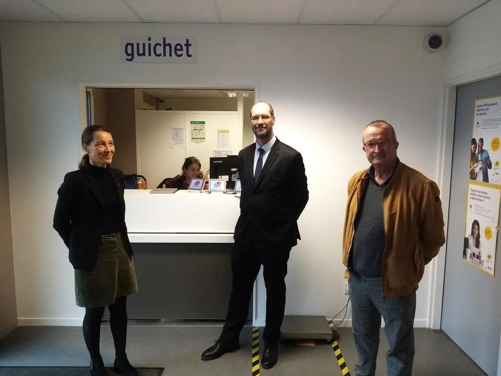 Virginie de Bettignies, responsable des relations médias, Anthony Davenel, directeur de secteur et Pascal Crossouard, maire de Candé au nouveau guichet de La Poste, ZI de La Ramée. © Ouest-France