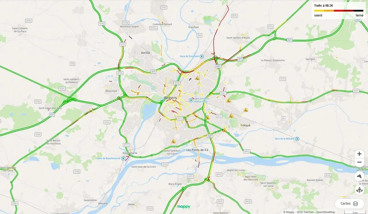 Ce mardi 13 janvier au matin, un important ralentissement a été constaté vers 8 h 30 par Bison Futé, sur l’autoroute A87N, dans le sens Cholet vers Angers (sens sud-nord). Ce ralentissement, qui s’étend de Mûrs-Erigné à Écouflant, concerne l’ensemble des voies.