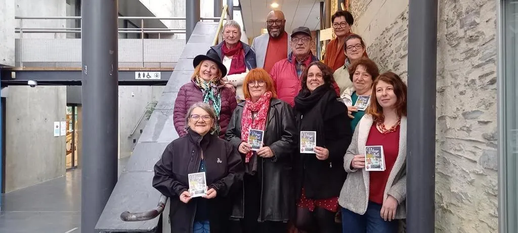 Les représentants des associations du pôle Hervé-Bazin, participant au village de Noël en présence de Chantal Jeoffroy, adjointe à la culture (seconde en partant de la gauche) et de Lamine Naham, maire (au milieu en haut). © Ouest-France