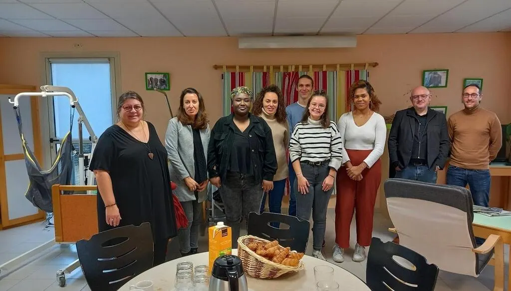Dans l’appartement pédagogique, au centre sur la photo, cinq des sept stagiaires en formation, Sarah, Denise, Samuel, Diane et Gwendoline, avec, à gauche, les formatrices Sophie Guyonneau et Stéphanie Cottenceau et, à droite, Jérôme Hurel, directeur du Cèdre et David Bahamed, conseiller à la relation entreprise à France travail. © Ouest-France