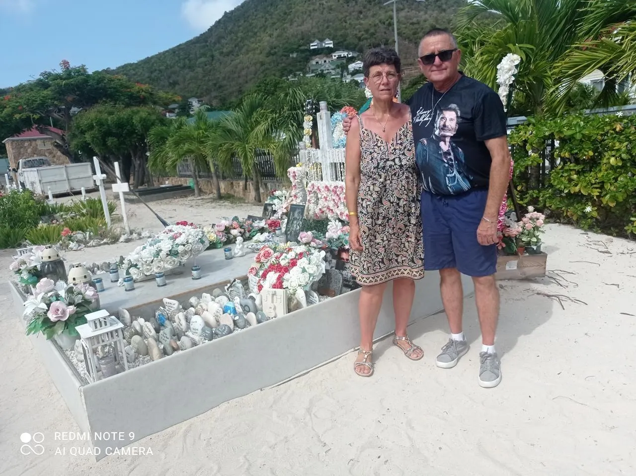Philippe et Nathalie Roche ont profité d’un voyage en Guadeloupe pour aller se recueillir sur la tombe de Johnny Hallyday à Saint-Barth. © CO – YG